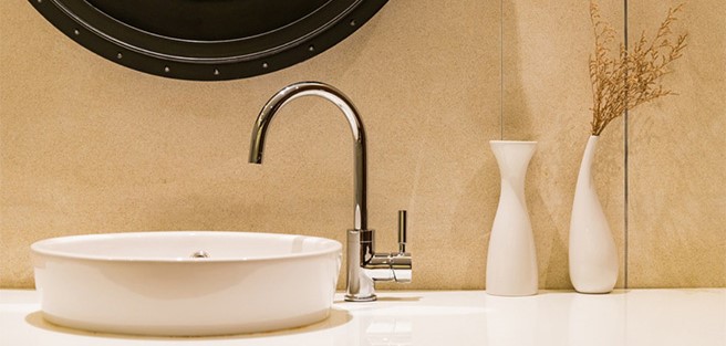 3. مناسب ترین شیرآلات برای سینک های کابینتی، شیرآلات پایه بلند روشویی است. استفاده از شیرهای روشویی معمولی و یا حتی شیرآلات ظرفشویی (که ارتفاع بیشتری دارند) در کنار این نوع سینک های فانتزی، به برخورد دسته اهرمی شیر به دیواره سینک و محدودیت حرکت آن می انجامد.